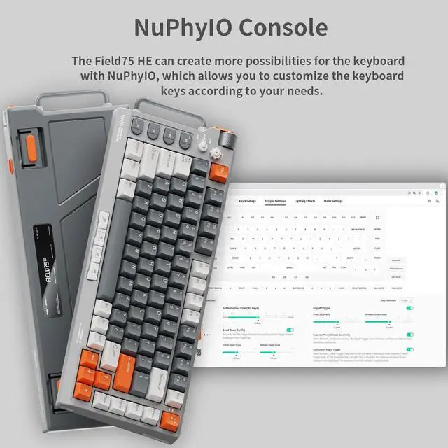 Driver Within a finger's reach - Field75 HE Gaming Keyboard customizable with NuPhyIO, making complex tweaks accessible for all; Tweak any performance parameter, see real-time UI updates such as the per-key rapid-trigger/sensitivity annotations on the keyboard preview, or the bi-color actuation indication bar; Global configurations can be saved as layers, to be fired up later