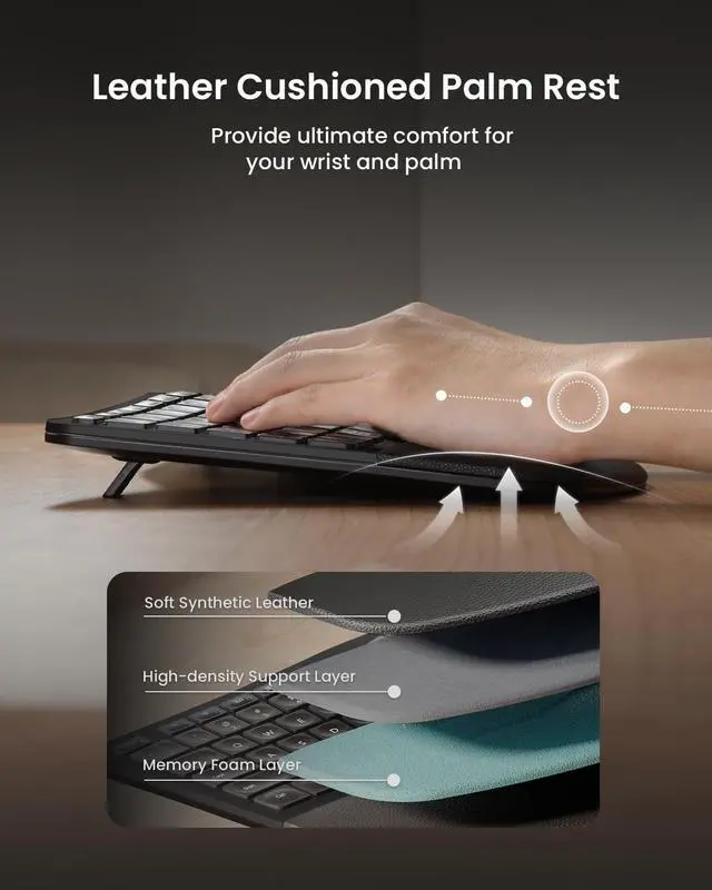 Cushioned Wrist Rest: Curved wrist rest with soft memory foam layer offers typing comfort with more wrist support, less wrist bending compared to other standard keyboards without wrist rest. Adjustable tilt legs design positions the keyboard at a perfect angle to keep your wrist in a relaxed and comfortable typing posture whether seated or standing.