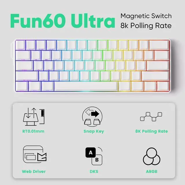 Highlights of FUN60 Ultra's Functions: The FUN60 Ultra, packs a punch with its functions, like DKS, Toggle Key, Mod-Tap, etc. Additionally, with high precision TMR sensor, FUN60 HE keyboard offers an amazing customizable range from 0.1mm to 3.4mm in 0.01mm precision step, suiting gamers seeking speed and precision