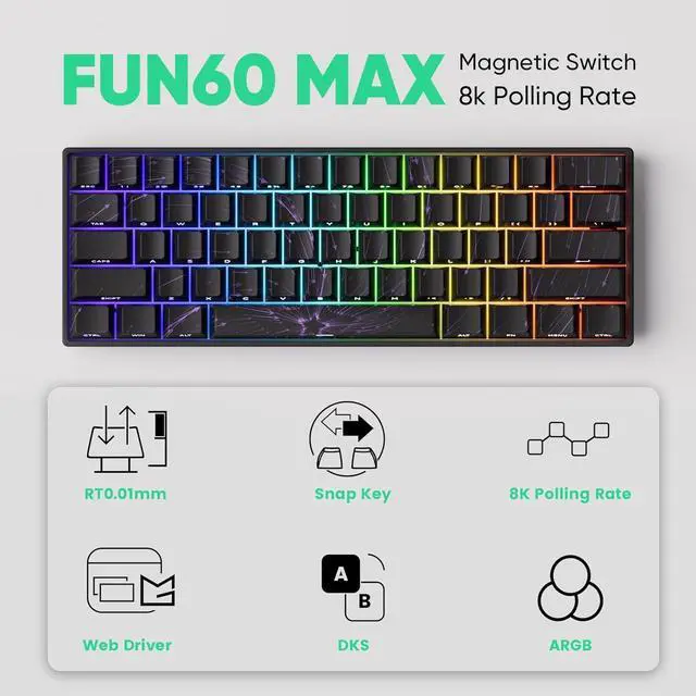 • Ultra-Precise Rapid Trigger: FUN60 MAX keyboard can achieve an ultra-accurate 0.01mm rapid trigger and the actuation distance can be adjusted in 0.01mm steps. Whether you're typing or gaming, users can fine-tune to ensure the optimal trigger for faster response times and enhanced precision. It's a must-have for competitive gaming