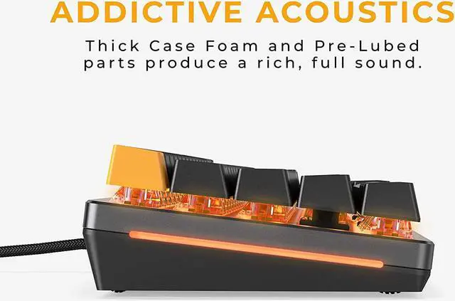 ABS Gaming Keycaps: Subtly textured for a reliable grip. Double shot fonts never fade and allow the boards per-key RGB backlighting to shine through. Creating the ultimate TKL mechanical keyboard