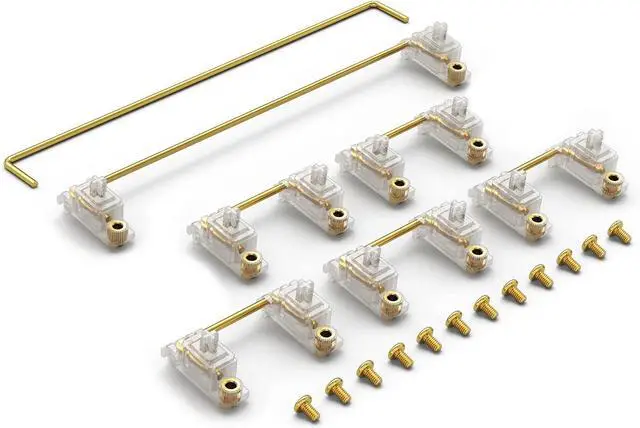 Set of 7 Stabs: Comes with 5 x 2u stabilizers, 1 x 6.25u stabilizers, 1 x 7u stabilizer, gold-plated wires, 12 screws, and 12 washers.y material