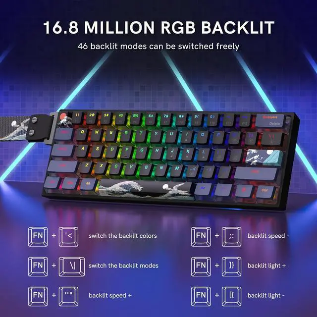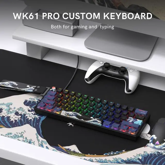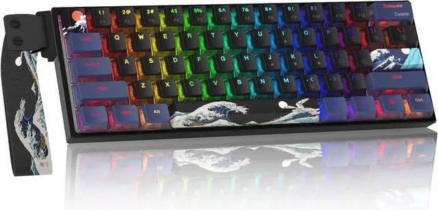 60% Gaming Keyboard - Compact,aesthetic but practical, ideal for FPS/MOBA gamers, paired with a light weight (<800g) and detachable USB-C wire for portability. Kanagawa Wave-themed keycaps blend Ukiyo-e art as a productivity tool and desk art