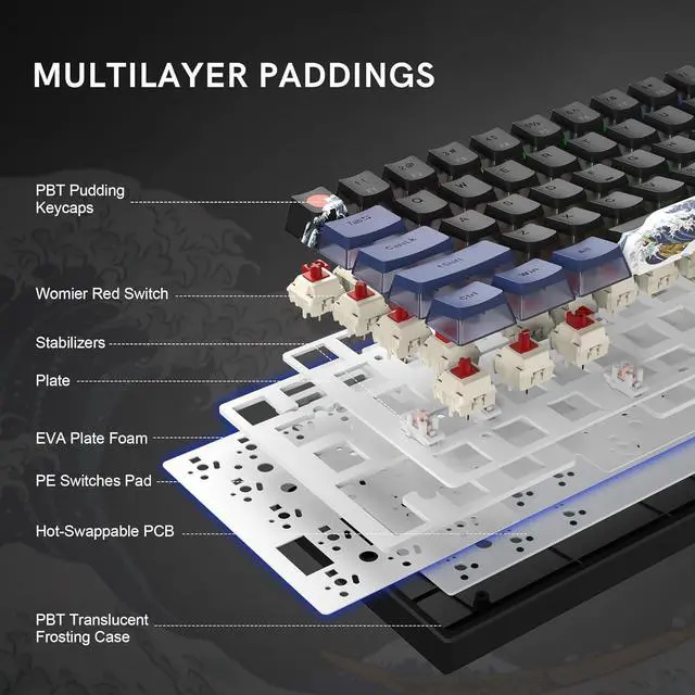 Silent Multi-layer Paddings - 4-layer sound-dampening foam reduces hollow noise by 60%, delivering waves-like smooth keystrokes and wave-soft tactility. The Outemu red switches balance silence and precision for work and play
