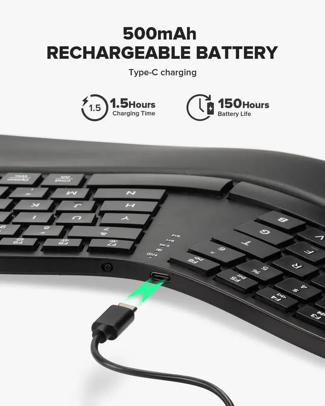 Curved Ergonomic Frame: A curved split keyframe offer natural typing, improve typing posture. Natural arc and slope design reduce wrist pain and shoulder pain