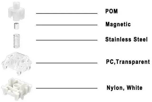 [Specs] Operating Force: 30gf, Bottom-out Force: 50gf, lnitial Magnetic flux: 102Gs, Bottom Magnetic flux: 905Gs, Pre-Travel: freely setting, Total Travel: 4.10.2mm, Stem: POM, Top Housing: PC, Bottom Housing: Nylon, Spring: 20mm, Pre-lubed: Yes, LED Support: SMD, Keystrokes: 100 million