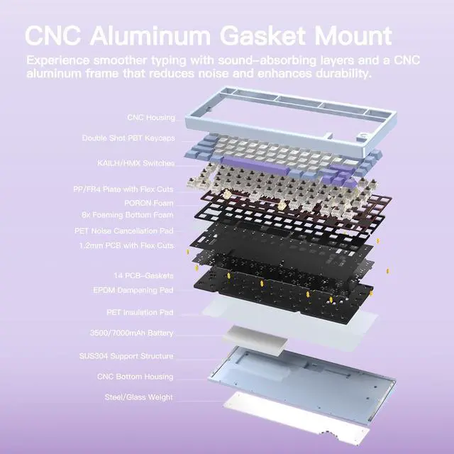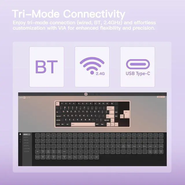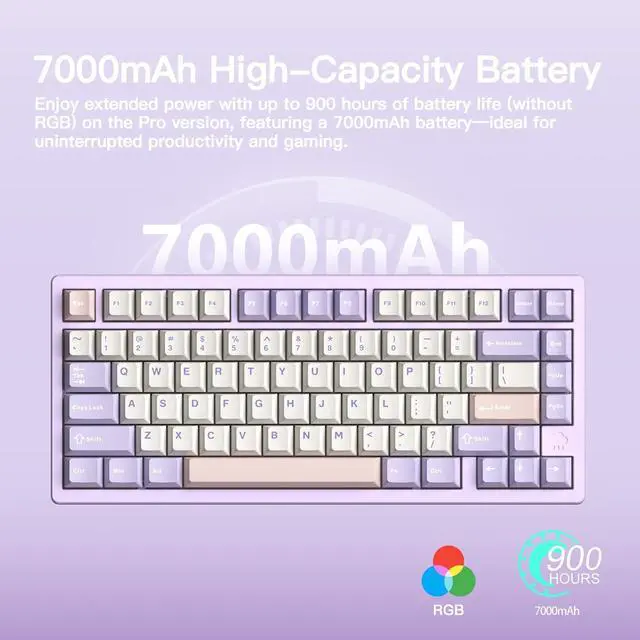 KEEBMONKEY WOBKEY Rainy 75 Aluminum Violet/Cocoa Switches Mechanical Keyboard with Superior Acoustics, Wired, BT, 2.4G Wireless Connectivity, RGB/FR4/Silver SUS304/7000mAh/Cocoa Switch (Pro - Purple)