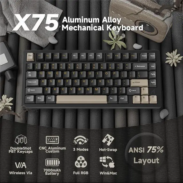 MANBASNAKE × ATTACK SHARK Mechanical KeyboardX75 creamy wireless keyboard Layout: 81 keys (75% gaming keyboard); Keyboard Material: National standard 6063 aluminum alloy, durable and corrosion and oxidation resistant. Keyboard Size: 12.8 x 5.5 x 1.7 inches; Weight: about 3.4 pounds.