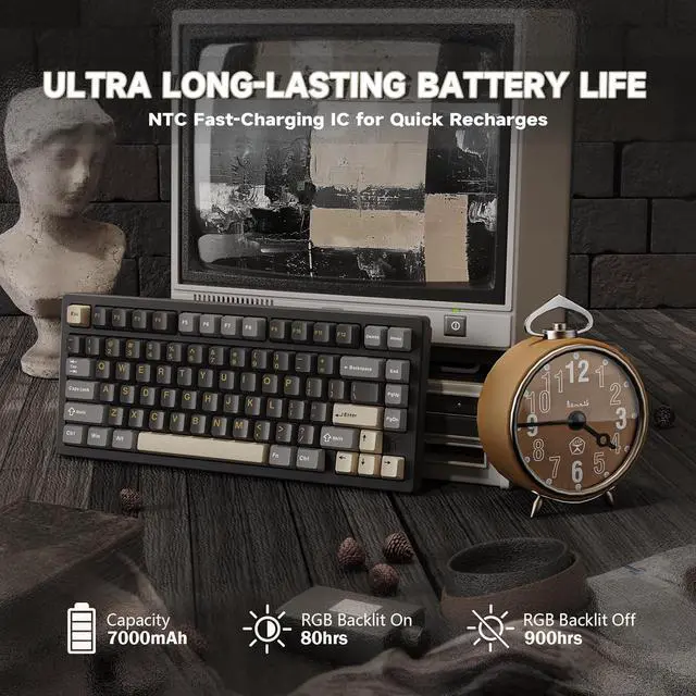 3-Mode Wireless Mechanical Keyboard & 7000mAh Large Capacity BatteryThis aluminum keyboard supports Bluetooth, 2.4GHz wireless and wired connections. Easily switch between 3 different devices under wireless bluetooth mode, suitable for the multi-device office, and perfect for RPG, MMO and FPS games. 7000mAh large-capacity sustainable charging. The keyboard supports fast charging and can be used for about 900 hours with RGB off.