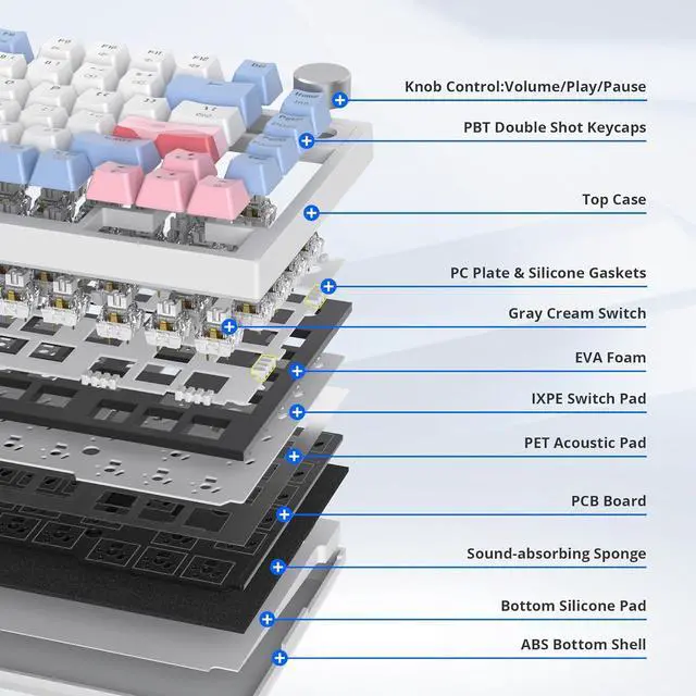 The V400por bcasts a five layers of padding and a plastic shell. This includes two layers of Poron foam, an IXPE switch pad, a PET sound enhancement pad, and a silicone bottom pad. Together, these components effectively minimize typing noise and resonance, providing a calm typing experience.