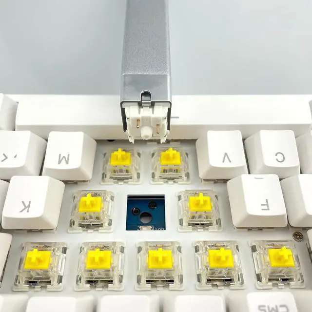 HOW TO USE1. Press the key on the top of the switch puller; 2. Push the switch puller in the detachable switches of your keyboard; 3. Tilted the switch puller about 5 degrees; 4. Pull up the detachable switches; 5. Press the key on the top of the switch puller again.