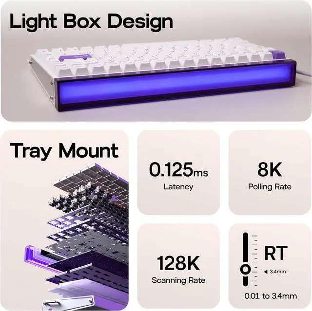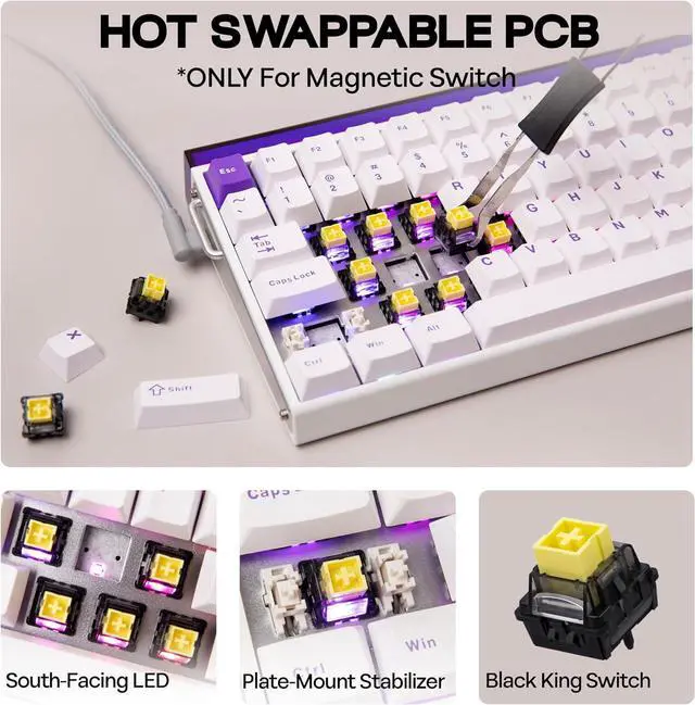 Hall Effect Magnetic Switch & 0.01mm Adjustable ActuationThe Hero84 HE boasts an adjustable actuation travel that extends from 0.01 to 3.4mm, delivering outstanding versatility suited for fast-paced shooter games as well as thoughtful strategy inputs. The innovative hall effect switch mechanism allows for activation without physical contact between the switch pin and the PCB, which minimizes the inconsistencies inherent in traditional mechanical keyboards, offering improved durability and a more refined keystroke feel.