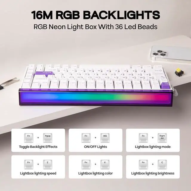 Customizable RGB Lightbox & Backlits The impressive lightbox design at the front provides an exciting and immersive gaming atmosphere. Equipped with south-facing per-key LEDs, the Hero84 HE shines brightly, offering clear visibility for daytime work and thrilling nighttime gaming. Forget about the hassle of locating keys in dim conditionseach command is effortlessly within reach, complemented by a vibrant RGB backlight that can be customized in terms of color, effects, saturation, brightness, and speed. Elevate your environment into a lively gaming sanctuary, relying on the Hero84 HE as a steadfast companion for achievement and a resilient surface for your creative endeavors.
