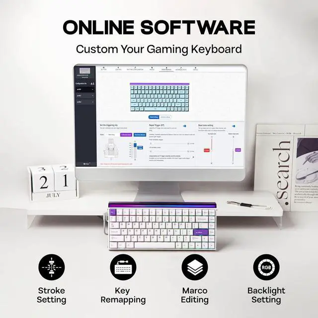 Programmable Web Driver Tailor your Hero84 HE gaming keyboard through the provided web driver. Reachable from any location via a Chromium-based browser, this feature lets you adjust key mappings, set up macros and hotkeys, change lighting patterns, and adjust the actuation point. By implementing Mod Tap or Dynamic Keystroke, you can assign several functions to one key, allowing for command activation based on taps, holds, or varying keystroke distances while maintaining control of movement keys.