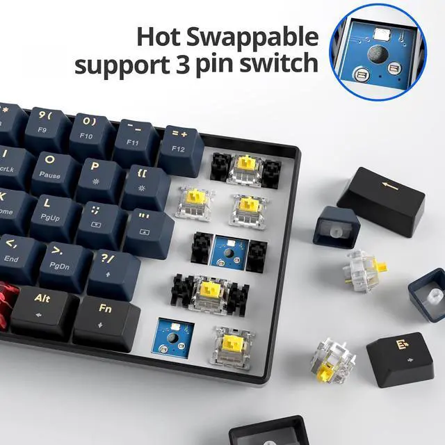 Hot-swappable: Hot-swap PCB allows you to replace 3 pins switches freely, compatible with any MX-style switch (brands like Cherry, Gateron and Kailh, etc.)