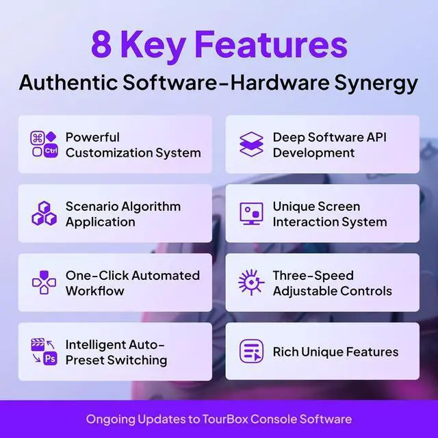 PHOTOGRAPHY POST-PROCESSING: made unprecedentedly simple, efficient, and fluid. With the unique button layout and updated TourBox Console 5 OS, you can easily control tasks like image selection, color grading, local adjustment, and recreation using one hand. The dial simplifies image selection, and knobs offer precise color control.