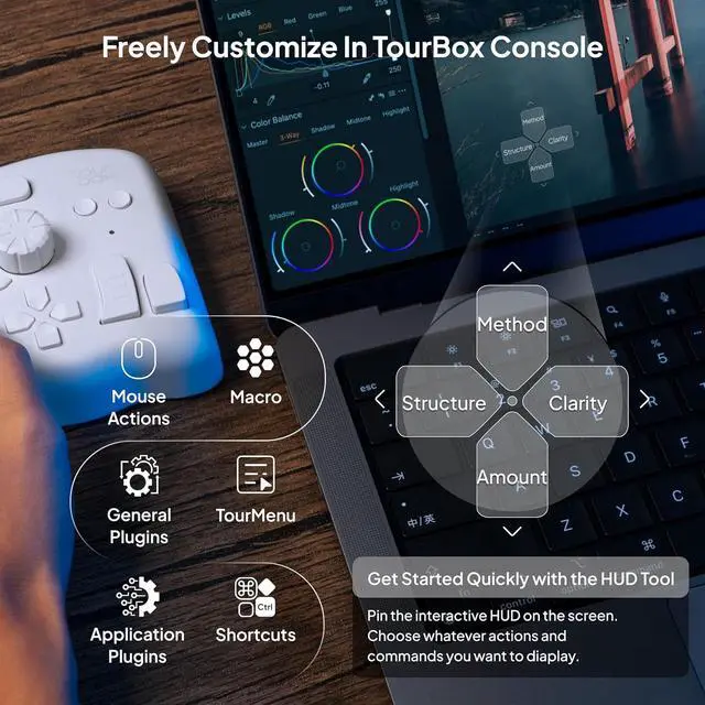 TourBox Elite is an upgraded Bluetooth console designed to speed up and elevate content creators' experience in video editing and color grading, photo retouching, and drawing. It simplifies the creative process, making it more efficient and seamless.