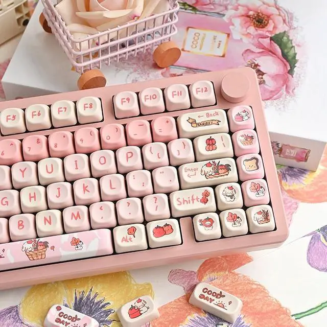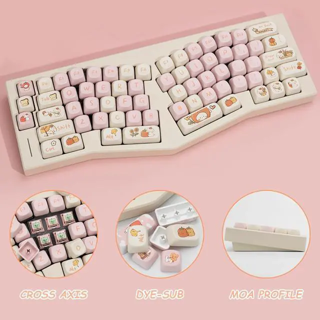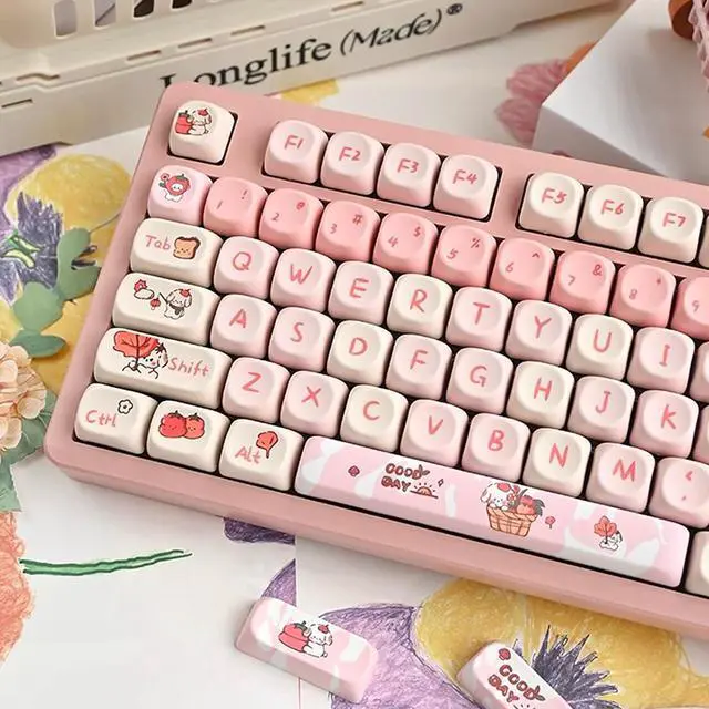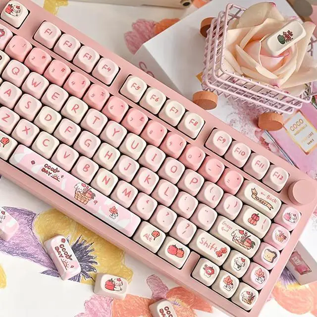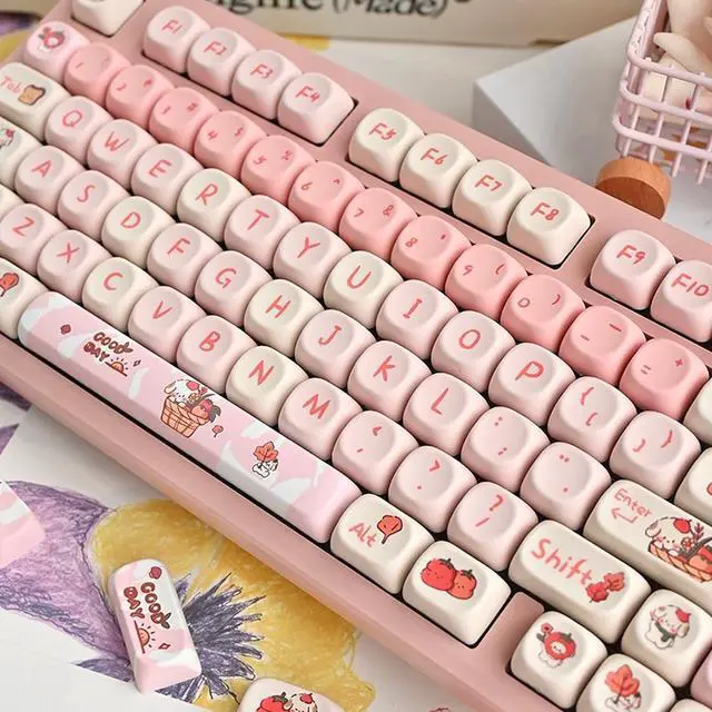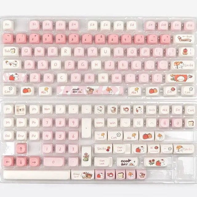 PBT Cute KeycapsThese 140 keys keycaps are made of high-quality PBT(Polybutylene Terephthalate) material,with a matte texture and anti-grease coating. These keycaps are resistant to wear and tear, feel good, thick and durable, fine workmanship, and not easy to get dirty.