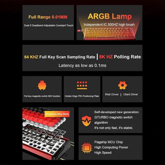 E-Sports-level High-performance Gaming Keyboard: With the support of customized high-frequency e-Sports-level chips, MG68 Pro can reach 8K polling rate + 64K ultra-high scan rate + 0.1ms competition-level ultra-low latency