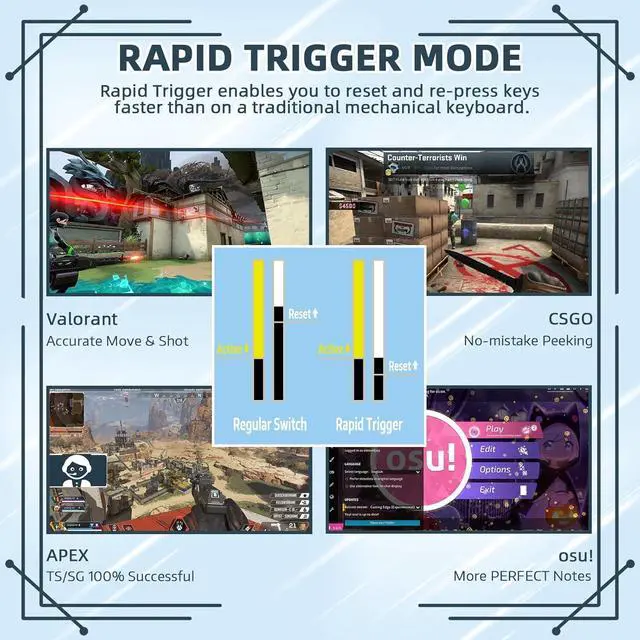 Rapid Trigger TechRapid Trigger removes any delay caused by the physical movement of the switch. Instead of relying on a fixed actuation like traditional mechanical keyboards, it immediately activates and deactivates the key with minimal travel for seamless continuous keystrokes, which gives players an advantage in FPS and rhythm games such as Valorant and osu!