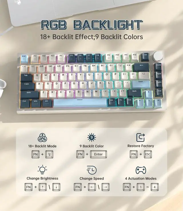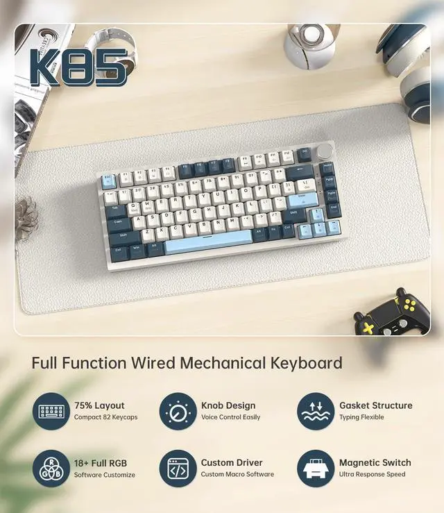 Gasket Mount & Gorgeous RGB BacklightK85 features a gasket mount system, a sought-after design in the mechanical keyboard world. To suit the gasket mount better, the K85 has a PC plate that is more rebouncing than regular steel plates, presenting pleasing typing sounds. RGB backlit keyboard has 18 built-in RGB modes and 9 colors. Through driver software, the keyboard RGB mode and light color can be customized.
