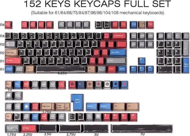 Important information1. This is a keycap, not a keyboard. The keyboard is not for sale. 2. Due to the difference in light and screen settings, the color of the item may be slightly different from the picture. 3. Please allow slight size differences due to manual measurement. 4. These keys are for US keyboards, for UK layout keyboards. Specifications1. Number of keys: 152 keys2. Material: PBT3. Applicable layout: suitable for 61/64/68/75/87/104/108 key mechanical keyboard4. Profile: Cherry Profile5. If the keyboard you are using not To determine whether it is compatible, please leave a message. After-sales service If you lose or damage the key on the way, please leave us a message, we will send the lost or damaged key to you as soon as possible. Box content: 1 set of keycaps.