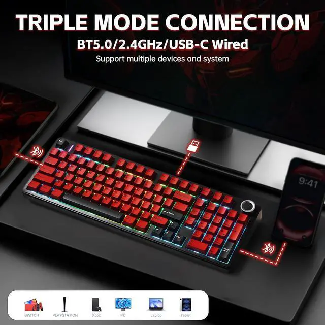 Gaming Keyboards Multi-Device Connection: AULA F99 Pro wireless mechanical keyboard provides three connection methods, including BT5.0, 2.4GHz wireless mode, and USB wired mode. It can be connected to up to five devices at the same time, and switch between them easily by FN and key combination keys and side button. No limits about your keyboard connection to meet the needs of work, gaming, and study.