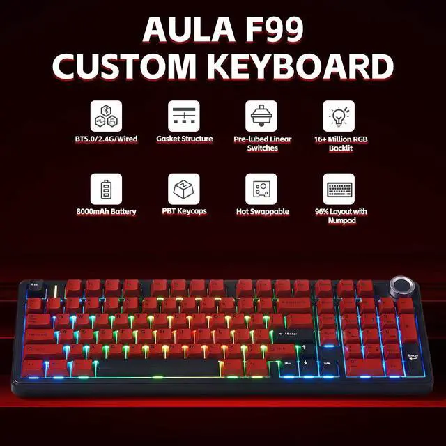 Mechanical Keyboards: AULA F99 Pro is a premium mechanical keyboard for both work and game. No matter the outlook,the construction or the function,F99 pro keyboard is definitely a professional gaming keyboard. This 99 keys full size keyboard layout compact can save more desktop space while retaining the necessary arrow keys and numpad for both gaming and work.Keys macro programmable to increase the probability of winning game and improve work efficiency.With 16 RGB lighting effect to adds a great atmosphere to the game room,customize key function and 16.8 million light colors.N key rollover,and supports WIN key lock to prevent accidental touches in intense games.