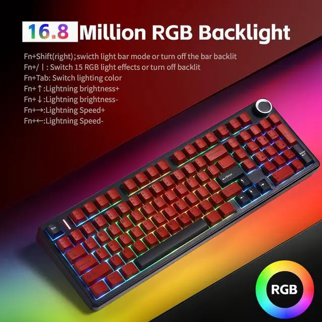 Multi-function Control Knob Keyboard: This AULA 96% wireless gaming keyboard is equipped with functional knob to switch backlit mode or multimedia mode. In backlit mode, you can rotate the knob to adjust the brightness of the lights, and click the knob to switch the lighting effects easily; in multimedia mode, rotate the knob to adjust the volume, and click the knob to play or pause. Long press the knob for about 5 seconds to switch modes.