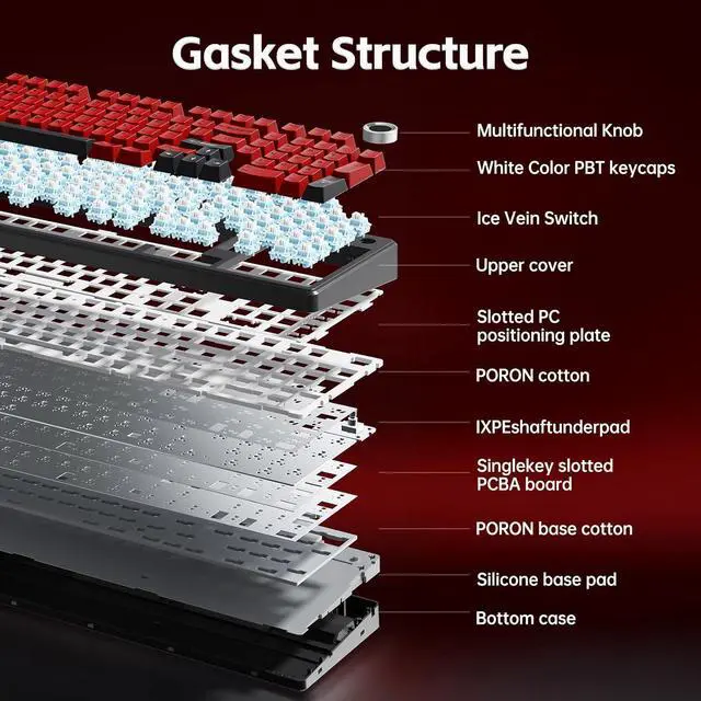 Wireless Creamy Keyboard Gasket Structure: This computer keyboard features a gasket structure, extended integrated silicone pad, and PCB single key slotting, better optimizes resilience and stability, making the hand feel softer and more elastic. Five layers of filling silencer fills the gap between the PCB, the positioning plate and the shaft,effectively counteracting the cavity noise sound of the shaft hitting the positioning plate, and providing a solid feel.