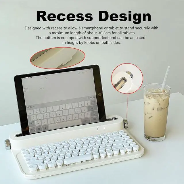 [Recess Design] This BT keyboard is designed with recess to allow a smartphone or tablet to stand securely with a maximum length of about 30.2cm for all tablets. The bottom is equipped with support feet and can be adjusted in height by knobs on both sides.