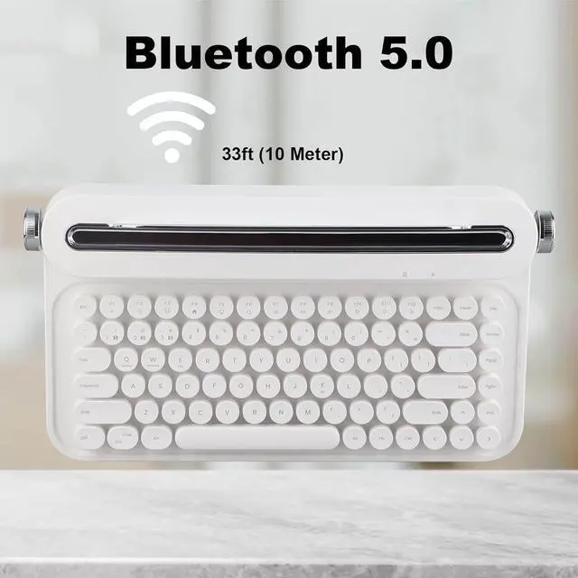 [BT 5.0] Vintage cordless keyboard features the latest BT 5.0 technology, providing cable free and clutter free connectivity with a 33ft (10 meter) operating range and no latency. Pair with up to 3 devices and switch between them using FN plus 1, 2, 3.