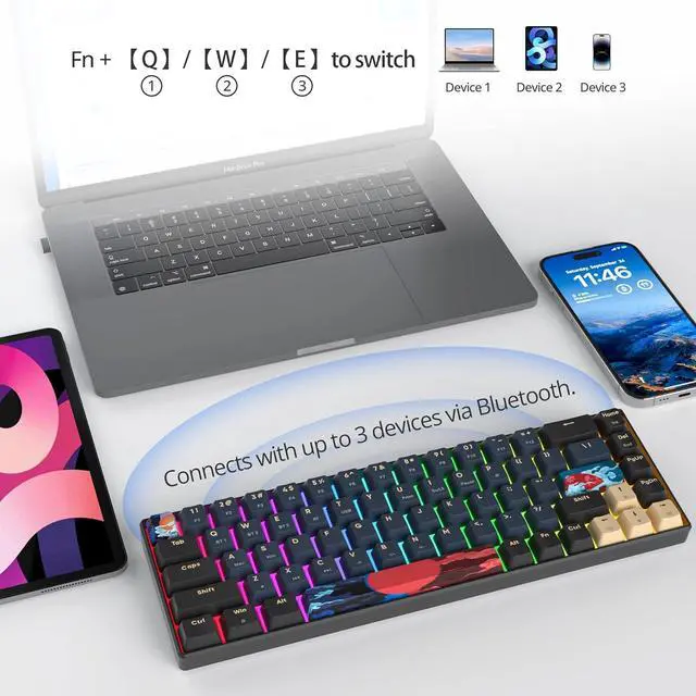 RGB Backlit Wireless Bluetooth keyboard: Surmen 60% mechanical keyboard with RGB backlight. GT61 wireless gaming keyboard is also armed with a 1800mAh battery, lasting up to 24 hours (tested with static RGB lighting), or up to 5 days of normal use (8 hrs/day)
