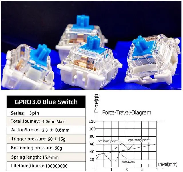 [Light operation] : The G Pro 3.0 Blue linear switch has a 60±15gf light actuation power and can trigger the key with a light press. This lightweight power makes it easier to type quickly and press keys continuously, Reducing finger fatigue.
