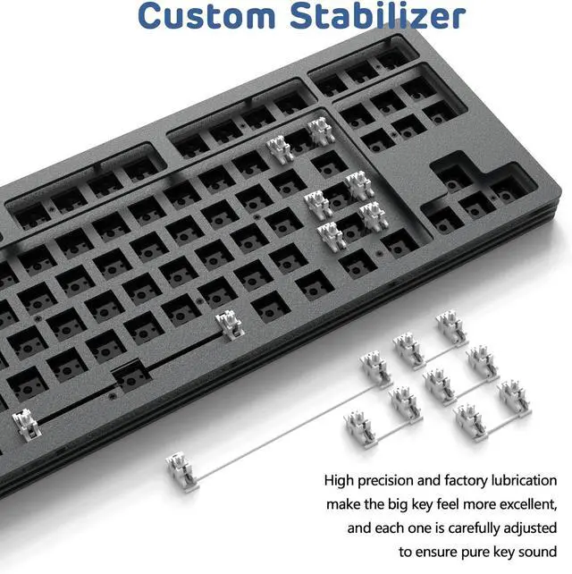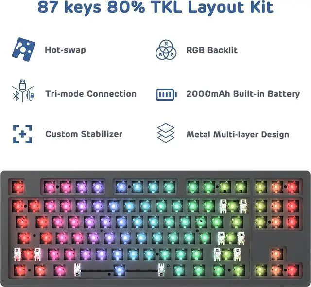 87 Keys 75% Compact LayoutAJAZZ AKC087 custom 3 mode mechanical keyboard DIY kit is designed in a favored compact 75% layout by the community to maximize the function while not waste a minimum of space. This layout is widely used and loved by the community and AKC087 will surely beyond your expectation with the hot swappable socket, amazing RGB backlights.