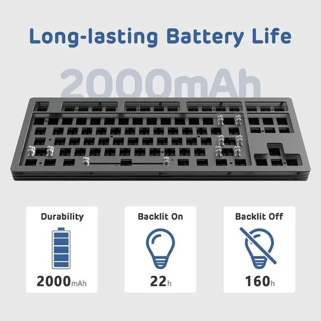 Rechargeable RGB KeyboardThe AKC087 wireless keyboard kit has a built-in 2000mAh lithium battery, which can be used while punching. There are 18 different lighting effects preset for the luminous keyboard, and you can also customize your favorite mode through the driver software. Different from the general RGB keyboard, the position of the lamp beads of AKC087 is lower, and the base is open, which means that you will see more brilliant lights.