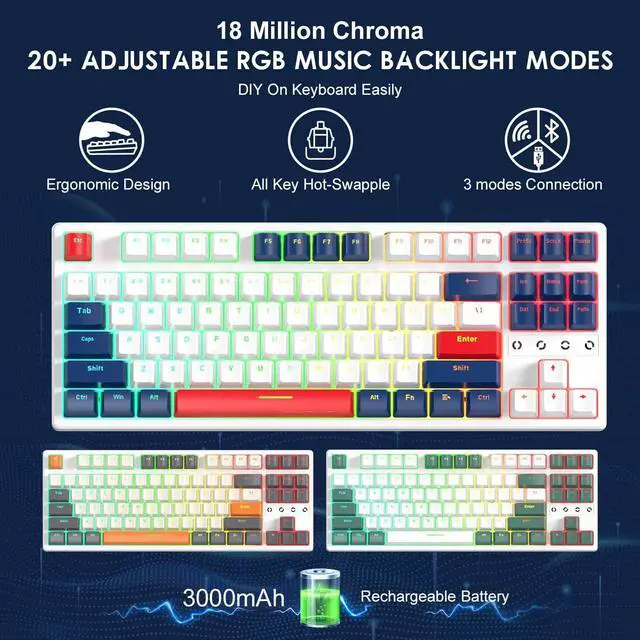 Hot Swappable 3/5Pin Clicky Blue SwitchesThe K87 hotswap mechanical keyboards is equipped with almost all switch types in the market no matter 3-pin or 5-pin.this pc gaming keyboards are basic on tactile mechanical switches,clear tactile feedback with audible clicky.Easy to mod or update it with your wishing preference.This is a unique treat for customizer and pc gamer.