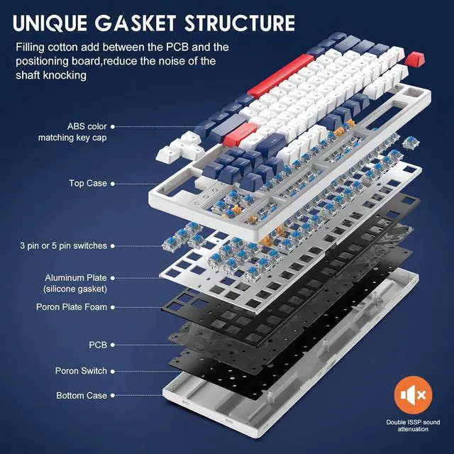 Dual Layer Sound Absorbing Silicone PadsTo achieve ultimate typing and gaming experience,The K87 Bluetooth keyboard adopts special structural design and dual layer silicone pads which are precisely designed both in structure and function.Two layers of silicone pads are placed respectively in the bottom and under the plate for better sound absorption.