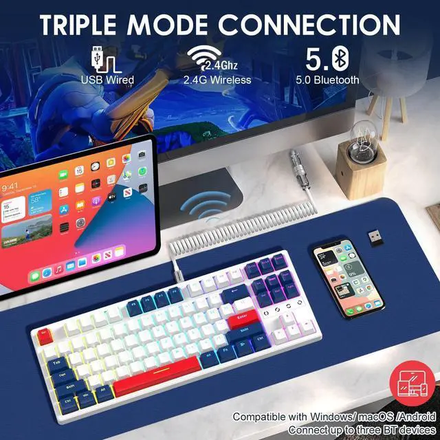 Triple Mode 2.4G/BT5.0/USB-CATTACK SHARK K87 wireless gaming keyboard is equipped with Bluetooth 5.0,a 2.4G wireless receiver and coiled usb c cable,you can connect k87 gaming keyboards with up to 5 devices at the same time for seamless multitasking across your laptop,phone,and tablet.This computer keyboard is compatible with Windows/ MacOS/ Android.