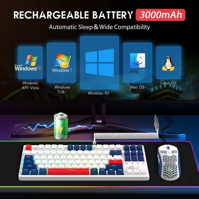 Large Rechargeable Battery3000mAh large capacity battery provides the wireless mechanical keyboard longlasting using time.At the same time,this portable keyboard has an intelligent power saving mode.If not used for 2 minutes,backlight will turn off and enter the first power saving mode.If not used for 30 minutes,the PC keyboard will enter sleep mode.