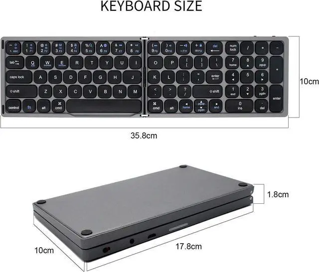 Rechargeable & Portable: Built-in a 180 mAh battery, the travel folding keyboard has 5 months standby time in a single full charge. (Note: Type-C charging cable included). Folding Size 7 " *3.93 " *0.71 ", it will easily fit in your briefcase or laptop bag. Perfect for using on planes, at library, cafes, or anywhere you want
