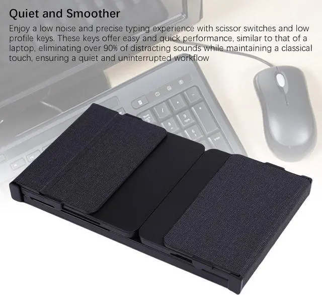 [Compact and Versatile Design] This portable keyboard features an 82 key layout including a numeric keypad offering convenience and versatility for work on the go. the foldable design achieves a compact size for travel and mobile use. we recommend using it on a flat for optimal performance as the folding hinge does not lock. its durable abs and pu construction ensures longevity while the sleek design adds a professional touch to your setup.