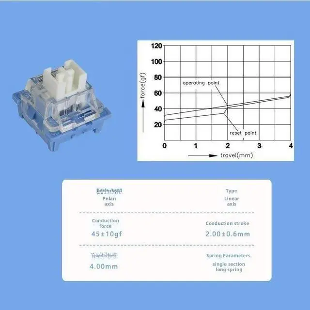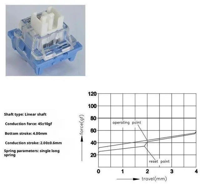 This switch features a pre-travel distance of 2.0±0.6mm and a total travel distance of 4.0mm, providing a quick response while maintaining full keypress depth. The internal single-stage long spring enhances rebound speed and stability, allowing each keystroke to feel snappy and fluid. Its linear structure ensures no tactile bump or audible click, making it suitable for shared workspaces or quiet environments.