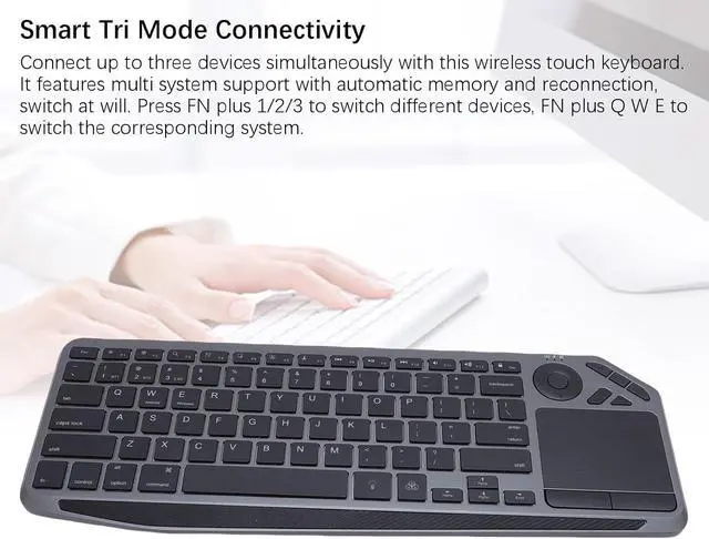Smart Tri Mode Connectivity: Connect up to three devices simultaneously with this wireless touch keyboard. It features multi system support with automatic memory and reconnection, switch at will. Press FN plus 1/2/3 to switch different devices, FN plus Q W E to switch the corresponding system.