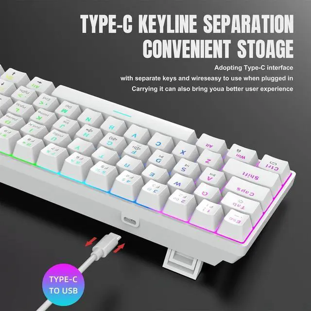 The 61-key corded mechanical keyboard desktop space saving. The detachable key and cable makes it more for you to carry and store,meeting the needs of mobile office and gaming