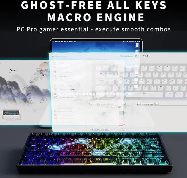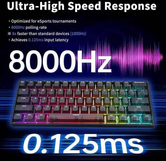 High-Performance Hall Effect Magnetic Switch Keyboard: The YK61 60% keyboard features advanced, magnetic switches and a lightweight, non-memory-intensive driver, delivering polling rates of up to 8000Hz for ultra-fast response times. As a hall effect keyboard, it leverages cutting-edge magnetic technology to ensure precise and consistent actuation without physical contact, eliminating wear and tear associated with traditional mechanical switches. This level of performance gives you a competitive edge in gaming with unmatched precision and reliability