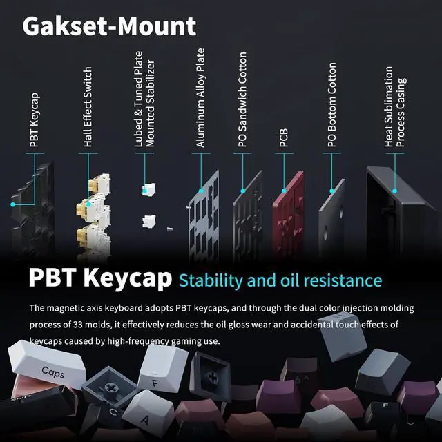 Mechanical Keyboard with Advanced Structure: The YK61 Magnetic keyboard features an advanced construction, extended integrated silicone pads, and PCB single key slotting to optimize elasticity and stability for a softer, more resilient experience. Multilayer of sound deadening material fills the gap between, effectively counteracting the cavity noise sound of the shaft hitting the positioning plate, provide a stable and comfortable