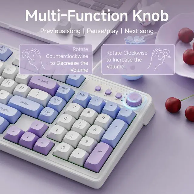 2-in-1 Function Knob: Gaming keyboard with 2-in-1 Function Knob is the highlight of this retro keyboard, the knob can be used for backlit mode, switch backlit and adjust brightness. Three volume buttons next to it can quickly adjust the previous song, the next song, and the pause.