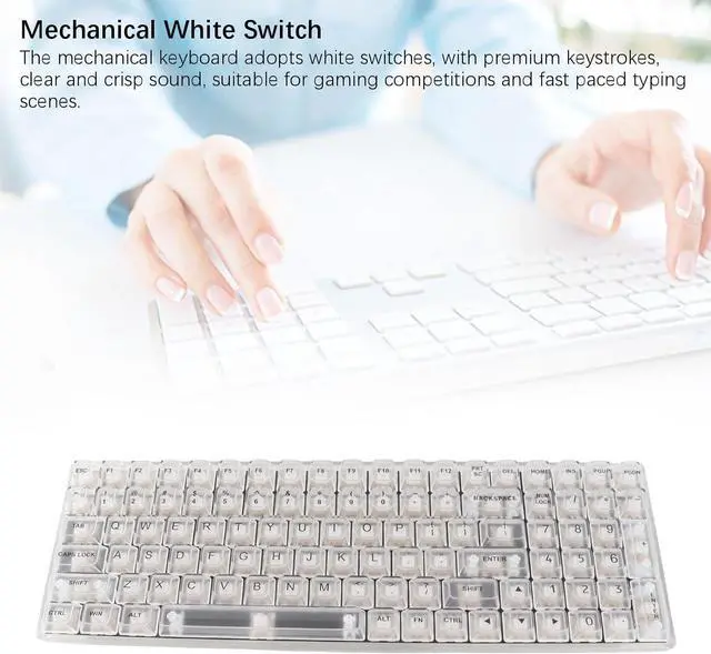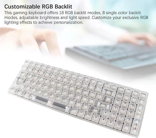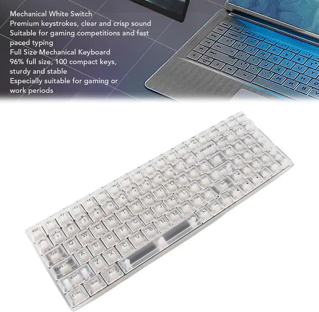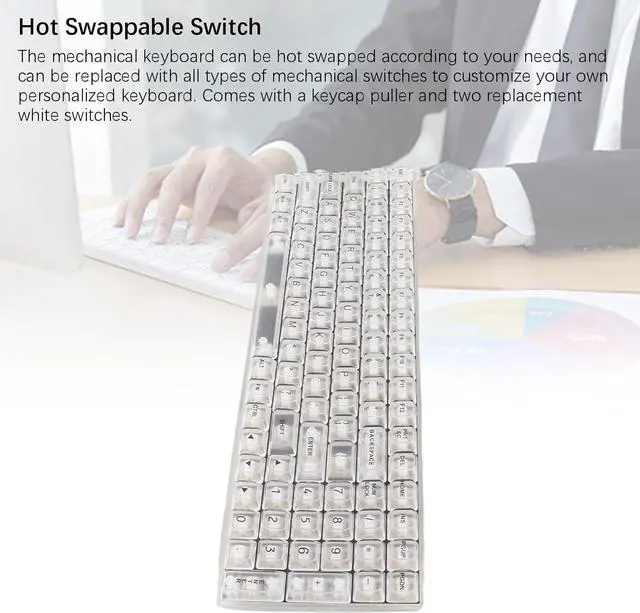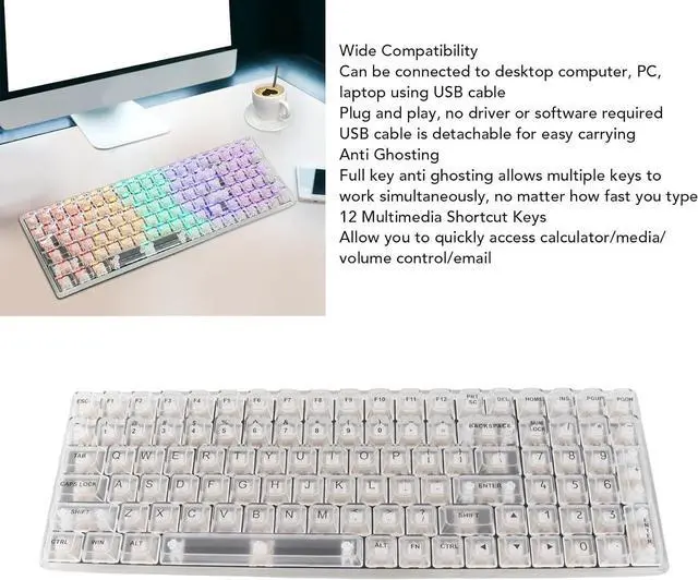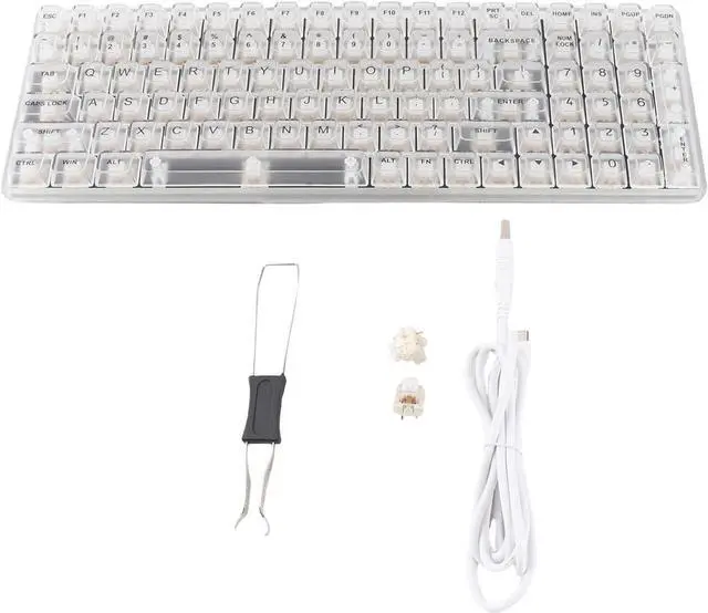 Upgrade your gaming and workspace with this 96% wired mechanical keyboard, combining a near-full layout (100 keys) with space-saving efficiency. Featuring hot-swappable white switches, customize your typing feel or swap in your favorite switches for crisp, responsive feedback. The dynamic RGB backlighting offers 18+ modes and adjustable brightness, syncing with your setups aesthetics, while multimedia shortcuts streamline productivity. Anti-ghosting technology ensures every keystroke registers flawlessly during intense gaming or fast typing. The ergonomic design includes adjustable tilt feet and a staggered key layout to reduce wrist strain. Plug-and-play compatibility with , macOS, and Android via a detachable 4.9ft USB cable makes it ideal for home offices, LAN parties, or travel. Includes a keycap puller and spare switches. (Specs: 100 keys | ABS construction | 1.5m cable).