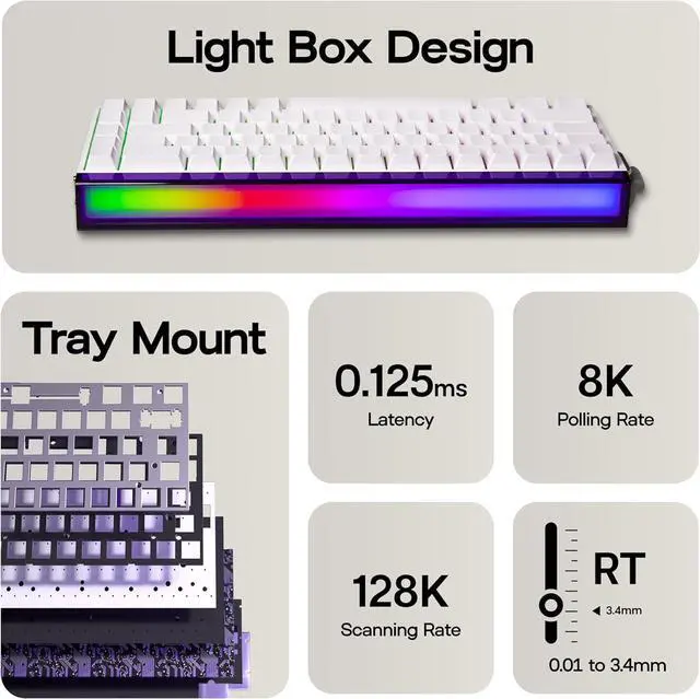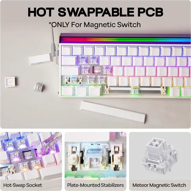 Hall Effect Magnetic Switch & 0.1mm Adjustable ActuationThe Hero68 HE boasts an adjustable actuation travel that extends from 0.01 to 3.4mm, delivering outstanding versatility suited for fast-paced shooter games as well as thoughtful strategy inputs. The innovative hall effect switch mechanism allows for activation without physical contact between the switch pin and the PCB, which minimizes the inconsistencies inherent in traditional mechanical keyboards, offering improved durability and a more refined keystroke feel.